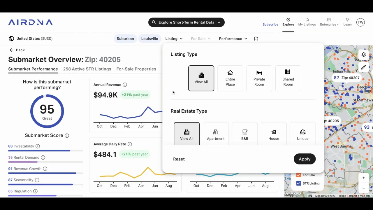 AirDNA offers market data for Airbnb and vacation rentals. Private equity investors use it when evaluating short-term rental markets, pricing strategies, and seasonal income potential.